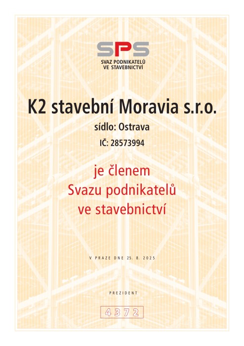 Firma K2 stavební Moravia s.r.o. v roce 2010 úspěšně absolvovala certifikaci ISO, kterou pravidelně obnovuje reauditem.
