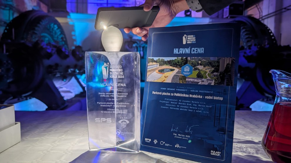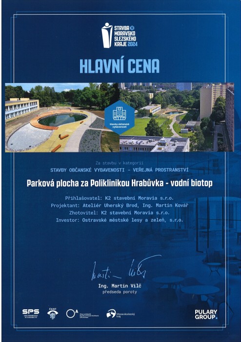 V 19. ročníku prestižní soutěže Stavba Moravskoslezského kraje, která se koná pod záštitou hejtmana Moravskoslezského kraje a ministra průmyslu a obchodu, uspěla i naše společnost K2 stavební Moravia. Odnesli jsme si cenu v kategorii Stavby občanské vybavenosti – veřejná prostranství za realizaci projektu Parková plocha za Poliklinikou Hrabůvka – vodní biotop.